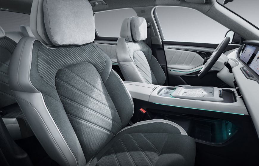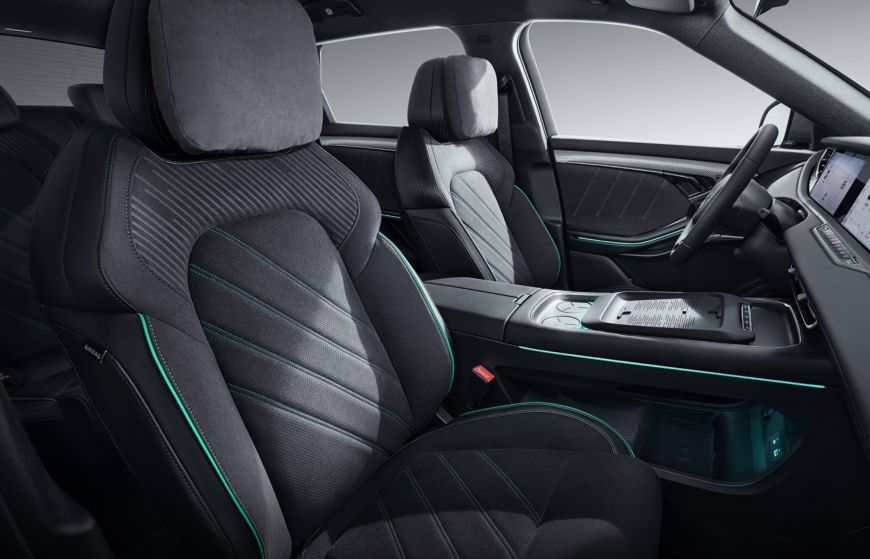 и алькантара в сочетании темно-серого цвета с изумрудной прострочкой и в светло-сером исполнении;