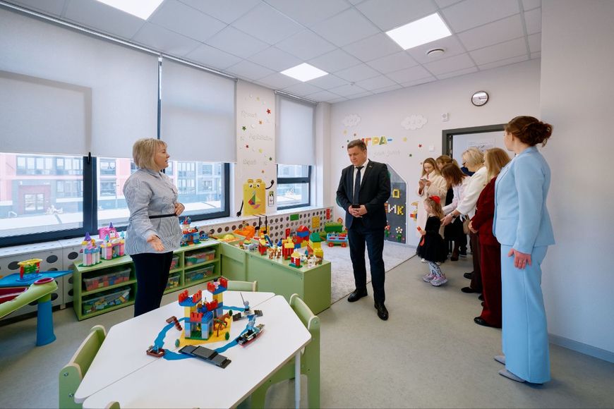 После торжественной церемонии все участники отправились на экскурсию по новому учреждению. Название «Кубики» нашло отражение не только на фасаде здания, но и внутри: на стенах групп, шкафчиках изображены кубические животные. А в ресурсном центре конструкторы нашли свое место даже на стенах.