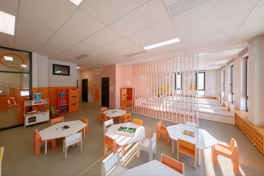 Помимо групп, в саду предусмотрены спортивный зал, музыкальный зал, медицинский блок с изолированными комнатами и отдельным входом, кабинет учителя-дефектолога, психолога, а также современный пищеблок с подъемником на 2-й и 3-й этажи. Все интерьеры выполнены в спокойных природных тонах, создавая комфортную атмосферу для малышей. В общественных зонах цвета более яркие и активные.